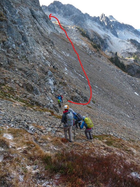 It's been warm and pleasant until we reach the saddle at about 11:15am. It's breezy and chilly here and the north side of the ridge is in shade. We put on jackets and helmet and drop 200' traversing under the ridge. The ground is hard with a bit of snow so we can't edge with our boots. Spots are slippery so we have to be very careful while aiming for the bench. We still can't see Grindstone. We stayed lower on the traverse on the return (as shown with the red arrow) which made it easier.