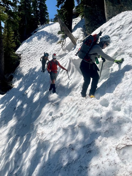 After reaching the saddle, we turned our attention to the north ridge. At 4,840' we encountered a large rock face. Initially we explored going right, but encountered a moat which made it very challenging, so we decided to go back down a bit, then explore to the left. We found a steep snow traverse, but this was much more preferable to the moat on the right. Since we had 2 students on their first snow scramble, we reviewed how to safely pass this crux using ice axe self belay. They handled it like a champ! After this crux, we continued toward the summit, eventually with a bit of rock scramble at the very top.