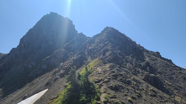 Photo taken on the descent. It's steeper than it looks in this photo. The double pieces of rock are on the right side of the photo.