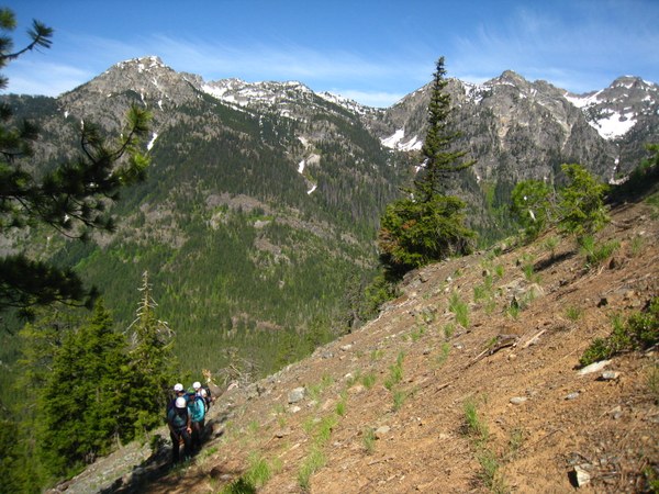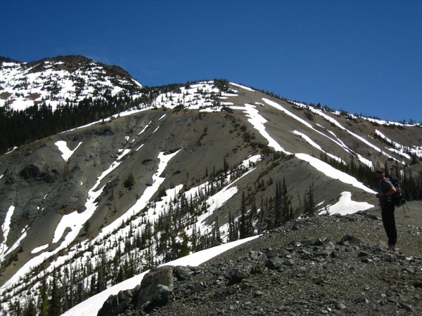 We took the road/trail to 3600', then went off-trail straight up to the knob at 4470'. This portion of the route was very loose & sandy soil (presumably fire damage); basically no trace of a bootpath. Very difficult to avoid dislodging rocks in this section; made for significant rockfall hazard; helmets needed. Rockfall hazard very low beyond the knob.