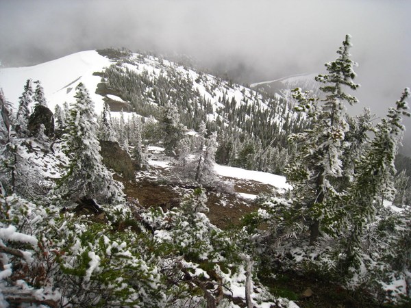 Cold, foggy June scramble, dusting of fresh snow.