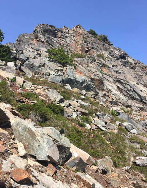 This was an interested scramble on a hot summer day. It started with a road walk, then following two non-maintained trails which took you to an old Helena Mine site. From there is was up to the notch in the ridge which lead to Helena. We followed the ridge from there, mostly on the east side of it. There was some 2nd and 3rd class scrambling, see pictures.