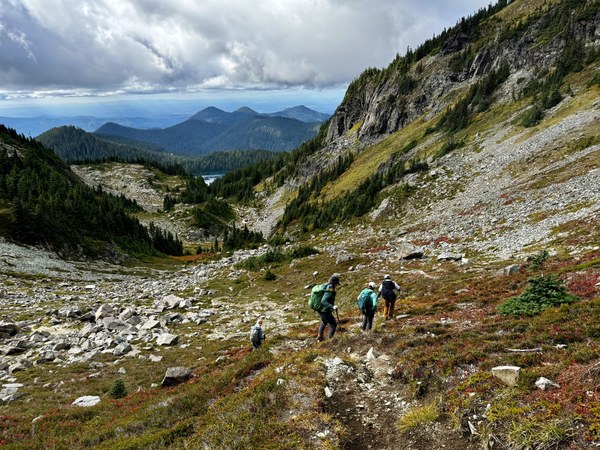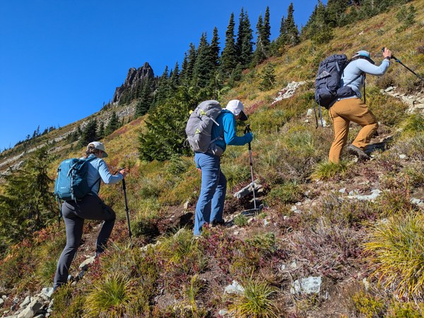 We appreciated seeing some fall colors and the crisp fall weather! The views of Rainier were also amazing, and we got to see several different types of clouds near the mountain at different times of day. We did the route counter-clockwise. The routefinding was fairly easy most of the way except in the boulder field between Mount Pleasant and Knapsack Pass. Some prior trip reports suggest going the opposite direction makes it easier to find your way in that section.