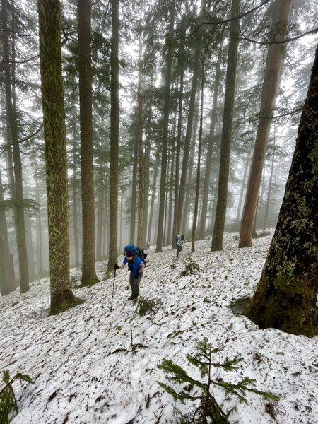 Snow scramble experience trip for scramble students. We had 2 students from Everett, 2 from Seattle and one from Kitsap - great to have a mix of branches on this trip! Parked at the lower spur road and joined the trail off FS 5510-120. It was a foggy day with some potential rain in the forecast. We didn't get any rain, except for the drops left on the tree branches. The mountain was caught in a cloud so we didn't get views either on this day.