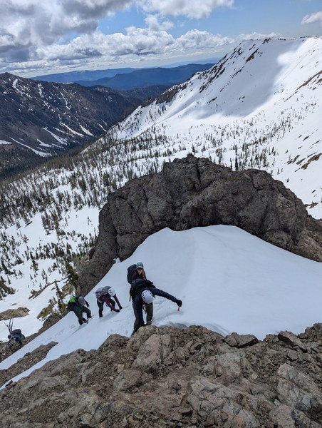 We scrambled close to each other in groups of 5 and with some trial and error found a reasonable way upward. At some point we had a small dip in the ridge with a neat cornice visible on the other side. That notch had some air on both sides and no obvious handholds which would make the return trip in particular, what over people might call "spicy". It was definitely way above T2 rating (my guess would be T4 at minimum) and I decided to turn the group of mostly scramble students around at that point. On the plus side we experienced enough T3 (?) rock here to make this count as a snow AND rock scramble.