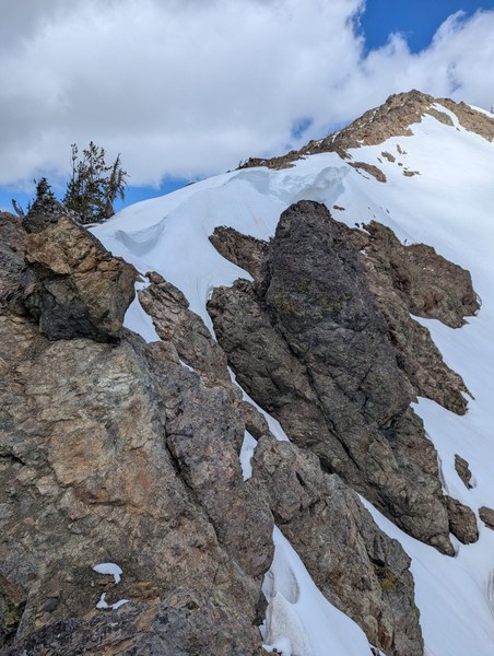 Thus we dillydallied a bit on some rock-snow transitions and made our way slowly up the ridge crest. The rock here is surprisingly brittle and there is a decent amount of scree and loose rock all over the place that you can catapult towards the person below you with little effort...