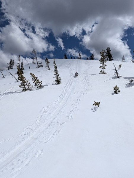 Route-finding was non-trivial. The use trail that we could spot from the saddle quickly vanished under the snow cover. I had two tracks for the ascent, one gaining the ridge proper and another one sidehilling which in the current conditions would have involved a lengthy snowfield traverse, again with questionable runout. Given the firmness of the snow I was not eager to take students through the snowfield but acknowledge that an hour or two later with snow softening this would have been a much better choice.