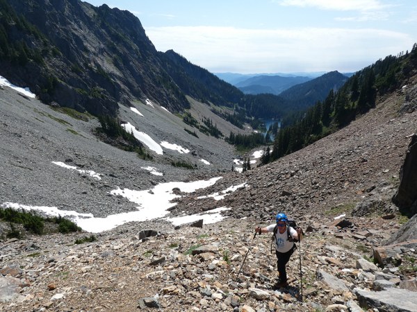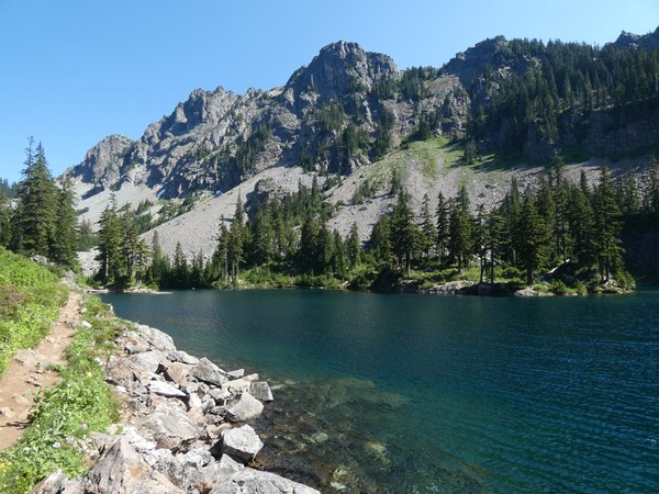 We started off at 7:30 from the Franklin Falls parking lot, following the connector trail and the old Denny Creek TH road to the actual Denny Creek TH. The first stream crossing at the waterslide was easy. From there the trail gets rocky and rugged. The second stream crossing now features a log bridge. We hiked over Hemlock Pass and arrived at Melakwa Lake at approximately 10:30.