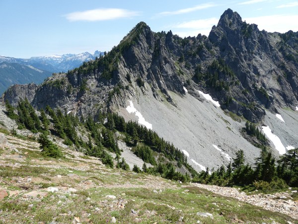 We followed a path along the steam crashing through meadows down toward the lakes. The path sucked us into a grove of trees and we ended up scrambling up along the creek bed. It is better if you stay right of this big grove of trees. We continued up the talus basin and aimed for the big rock buttress underneath the White Ledges.