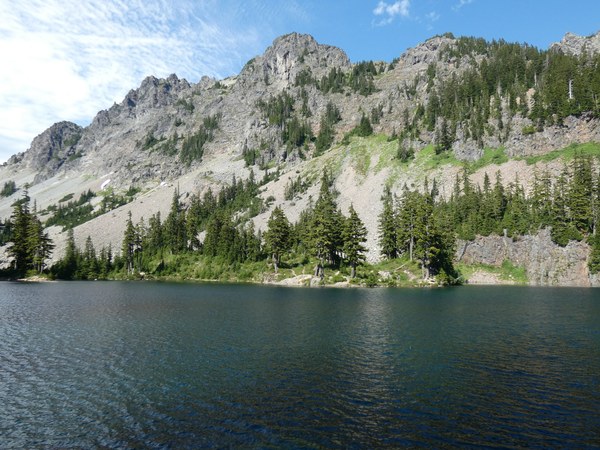 I topped off my water and we continued along the left side of the lake. We hopped the stream between the lakes then skirted around the right side of the upper lake, enjoying the view up toward Kaleetan Peak.