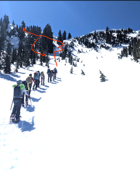 At this point we would have to do a short traverse down to the saddle between the two peaks. It's definitely doable but there is a bit of exposure that requires some care (proper ice axe usage and removal of snowshoes). Since it was getting late we decided as a group to call it quits here and be content with bagging the East summit.