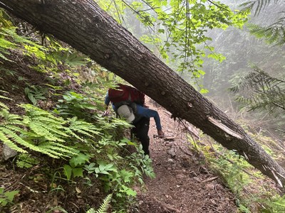 The plan was for a moderate but steady pace, around 1,250'/hr, and for the leaders and participants to be prepared for a steep approach trail and off-trail travel that would require crampons, ice ax and exposed rock scrambling, and the possible use of a fixed line. We agreed to carry both a static line and dynamic rope because Todd remembered a knife edge traverse and sometimes folks are more comfortable with a hand line coming off the main summit. The most recent trip reports came from the WTA (friends Ron and Bob), and Peak Bagger. There is also beta in Peggy Goldman's Washington Scrambles, and the Mountaineers, Olympia Mountains Climbing Guide. The trip is rated at 8 miles round trip and between 3,700' and 4,100' gain depending on the source. Quite a few GPS tracks show the mileage closer to 6.5, but I think that's due to steep slopes nearly the entire way, and heavy tree canopy. I had anticipated about a 9 to 10 hour day. I chose an 8AM trailhead start since the days are long. For a turn around time, I mentioned that we'd monitor things. I'd set my first alarm from 11AM, but if we were not on the ridge by 1PM, we'd need to seriously evaluate things.