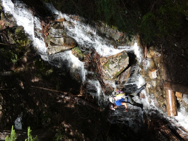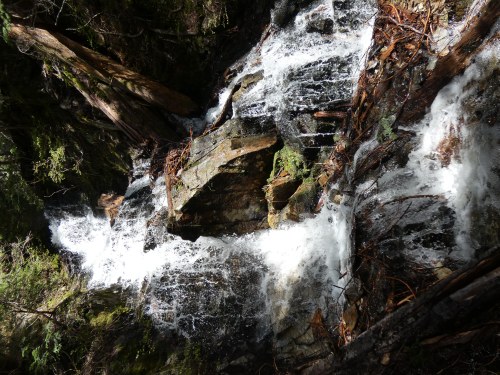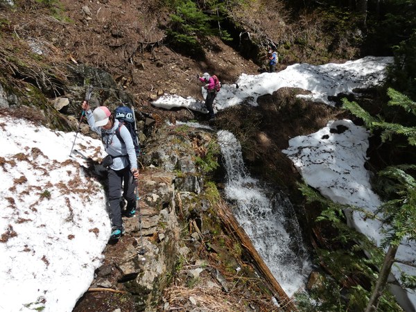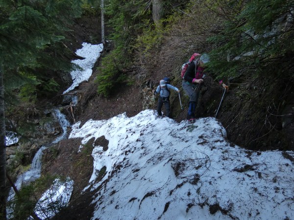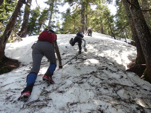 The snow begins on the Tunnel Creek Trail at about 3600 feet. The trail crosses two waterfalls and just past the second waterfall, there is a steep snow bank blocking the trail with a drop-off, which requires ice axes to safely cross this brief section.