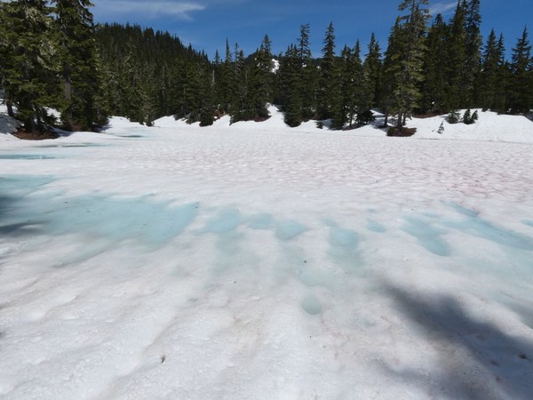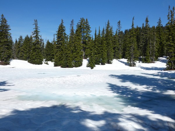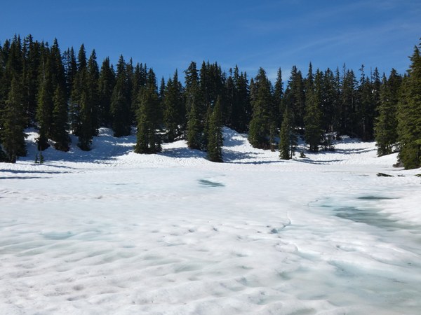 We reached the PCT near Hope Lake at 8:55 and were surprised to see the lake still mostly covered in snow and ice! We proceeded northbound on the PCT, which was completely snow covered with no trail markers. On the way up to Mig Lake, there were many places where we just used the trail as a guide as we cut up the fairly easy forest slopes. We reached Mig Lake at 9:25, which was also covered in snow and ice.