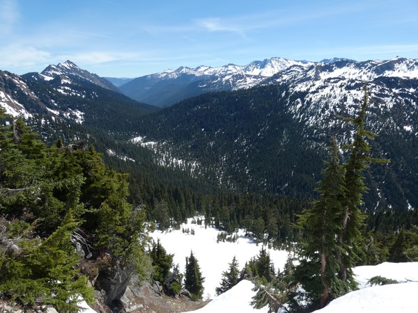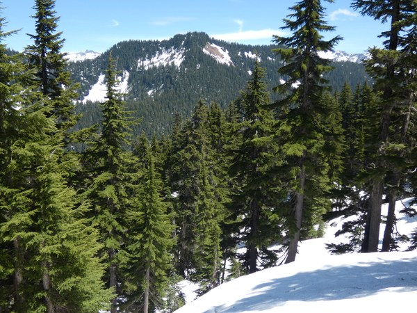 About 1/4 mile from the PCT the trail is completely lost under snow and on the way in we went too high above the trail but still fairly easily reached the PCT. The entire Hope/Mig Lakes basin is still 100% snow covered with both lakes still mostly covered in snow and ice. The PCT from Hope Lake to Lux Peak is completely lost under snow and while we used the trail as a guide, we often cut the trail in many places. Route up Lux Peak is straightforward steep open snowy forest.