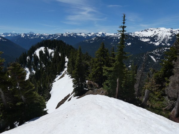 The views are actually best a little to the south along the summit ridge, with views north toward Glacier Peak, east toward Jim Hill Mountain and Bulls Tooth, south toward Mt. Stuart, The Cradle, and Mt. Daniel, and SW toward the Thunder Mountain group.