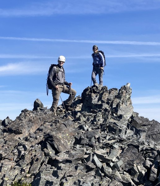 After a relaxed break and snack, we retraced our route down McNeeley, descended into the Huckleberry Basin, and hiked back up to the Sourdough Trail. After a little over a mile we left the Sourdough Trail and made our way up to Antler Peak. There is no clear route to the summit rocks. However, my fuzzy memories from a previous trip combined with two more pairs of sharp eyes got us to the summit in short order!