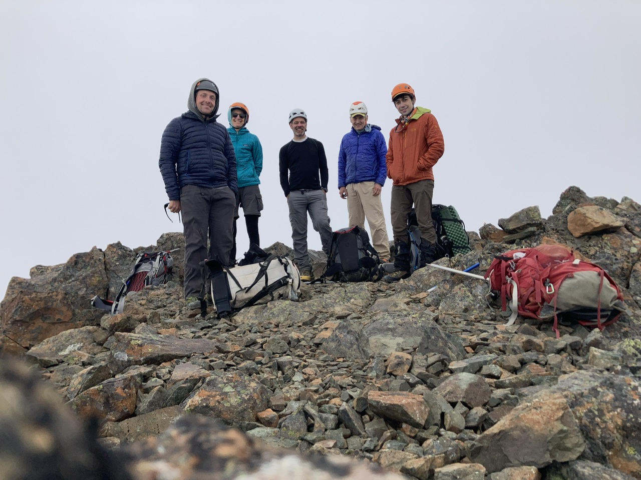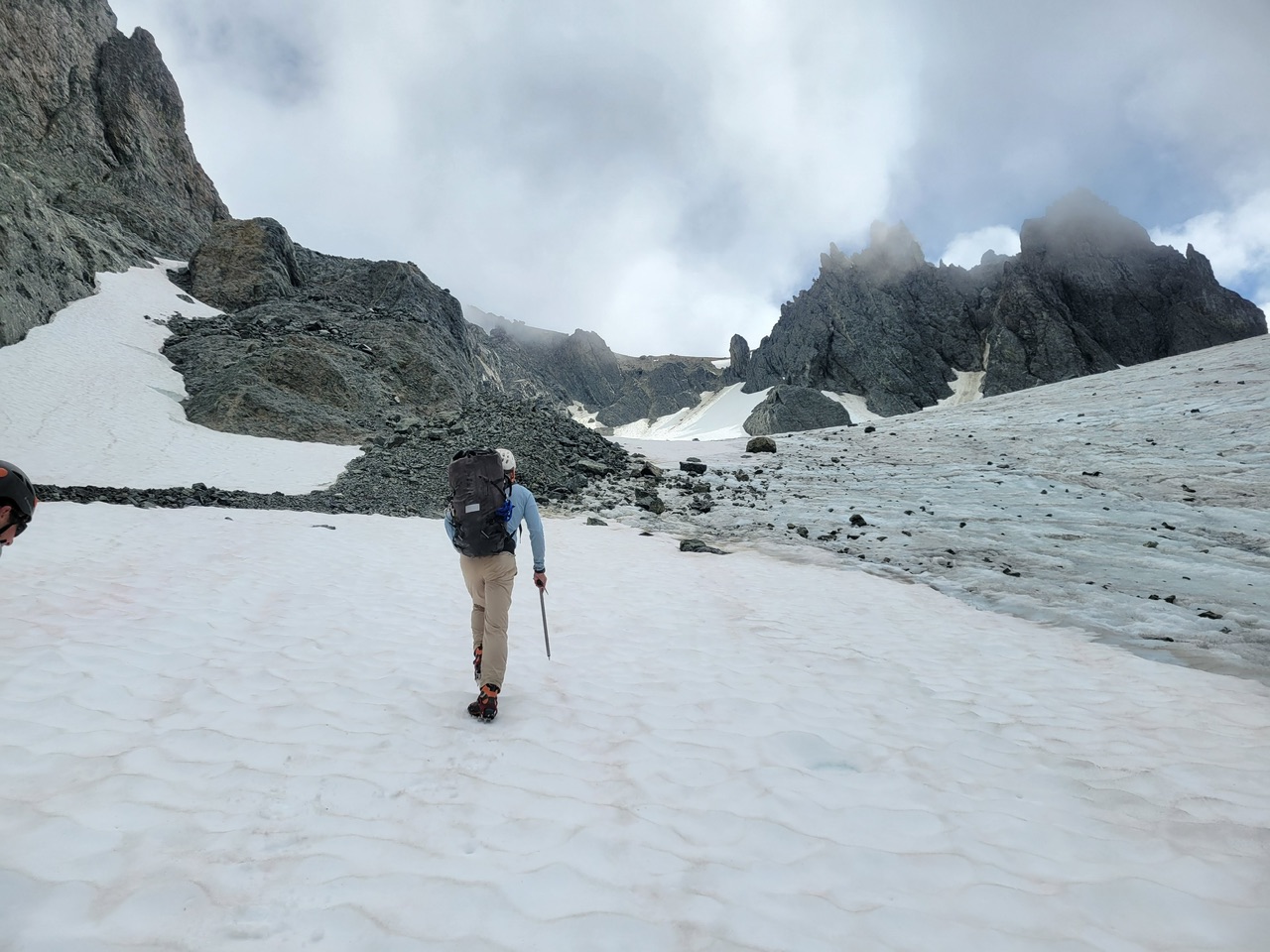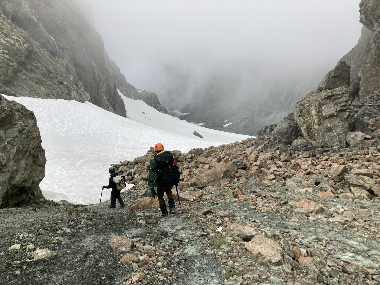 The final slope on the NW side of Surprise Col was quite challenging with copious amounts of small (and not so small) rocks just at the angle of repose. We were extremely glad to have our small party size of 5. For this last part we split into left side and right side groups, with frequent zig-zagging to stay out of one another’s fall line.