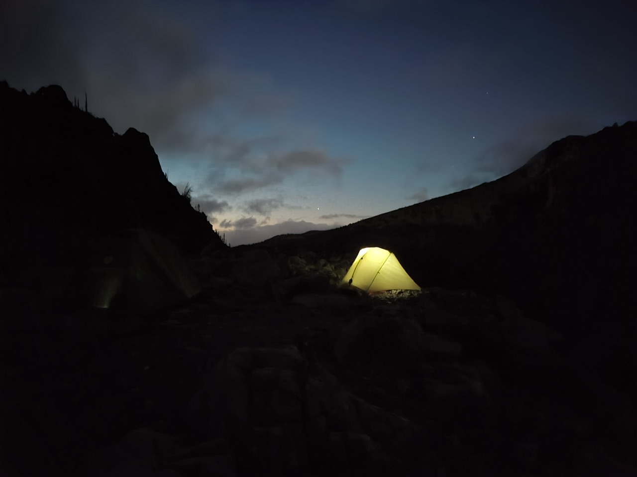 After slow going on descent through very loose rock (plus our last 900’ of gain on a 12 hour day) we finally reach camp [tarn + 8 hours].