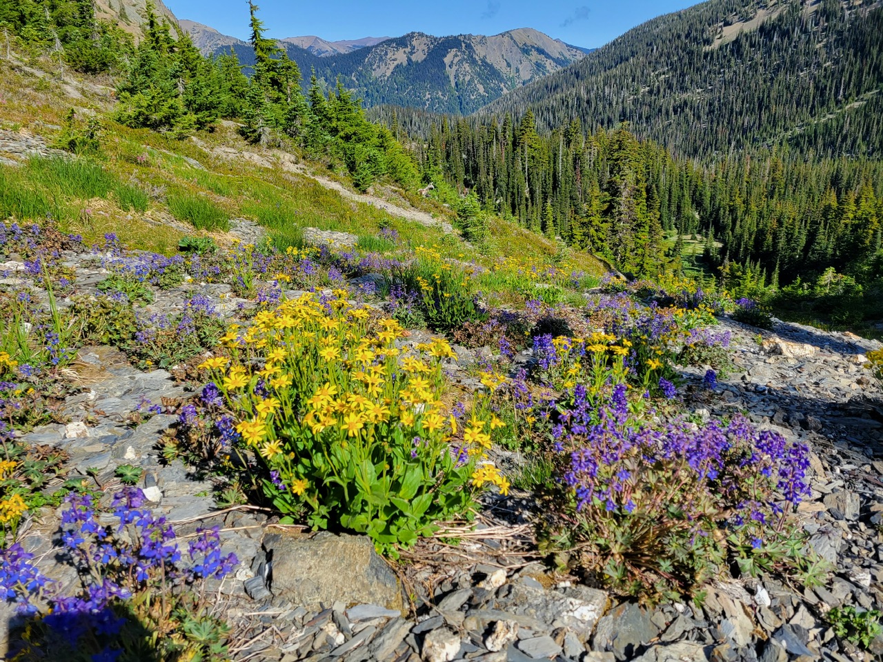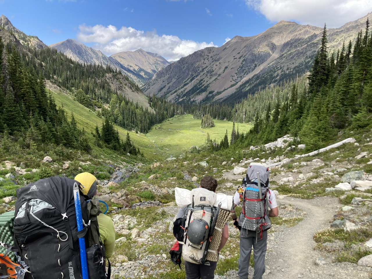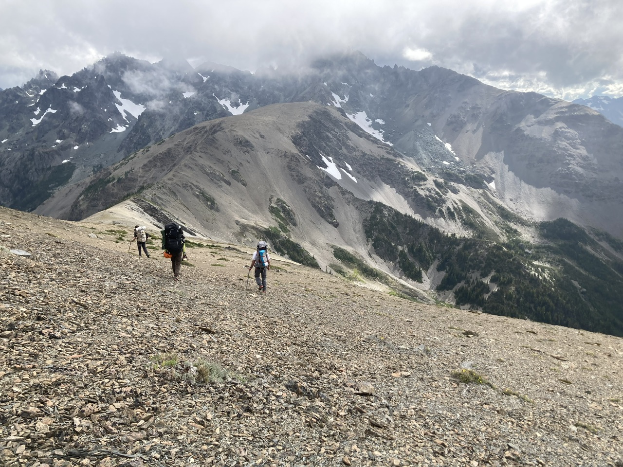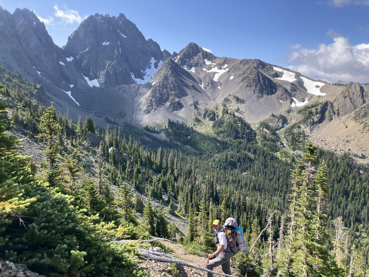 Our first day (one of the harder days at ~6000’ gain, made even more so by no running water until camp) was mitigated by using the upper trailhead at ~3200’ [47.88283°N 123.14274°W]. Here we take a break before tackling the ~7200’ high point on Gray Wolf Ridge (via a reasonable boot track near the ridge crest).