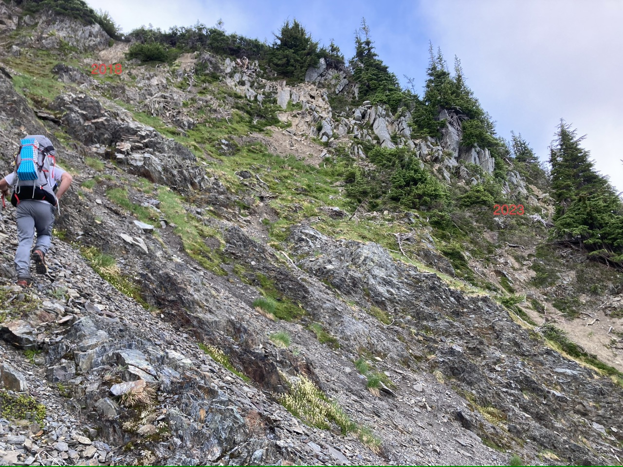 … leading to this choice point near [47°51.528'N 123°14.702'W]. Our consensus for future trips was to use the 2018 route (not as much exposure as 2021, but shorter and with less brush that this year’s 2023 choice).