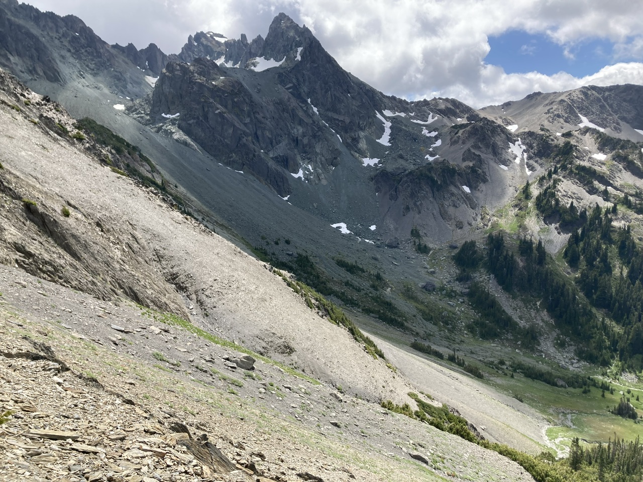 A glimpse of Needles peaks as we leave the Deception Glacier basin [tarn + 5 hours].