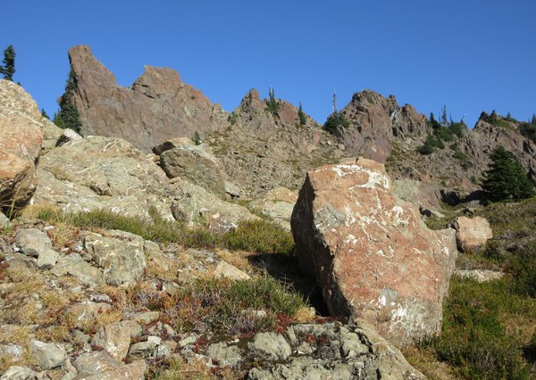 It was a rare and amazing treat to see that area without any snow! This route is usually done only in winter in optimal conditions as a snow scramble with a fun glissade. The chute is mostly stable rock/roots/small trees with a couple of nice heather meadow areas. But it boggled my mind that those huge boulders become covered with so much snow to make a smooth surface! And the rock types and formations that I never saw before were just fascinating. It also made it easier to understand why it's an avalanche chute, and why deep holes in the snow form in late spring - they would be quite deep and a fall into one would not be good.