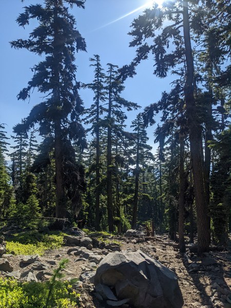 A little past the junction, keep following the trail that leans left gains gradually past the tree cover - The tree cover gradually breaks at about 2.5 miles in at 6500 feet. From here the trail becomes more rocky/ bouldery with hollow volcanic rock. It is advised that folks start very early on this trail, as there are no water sources and it gets really hot on sunny days. Lucky for us there was a gentle breeze keeping us company