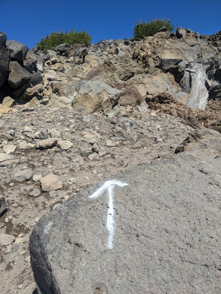 At the rock outcroppings - you'll start noticing white painted arrows pointing the direction of the trail - as it dissapears in the volcanic gravel. This is a reminder of the trail head warning that people do get lost on the way down- as there are no clear trail signs