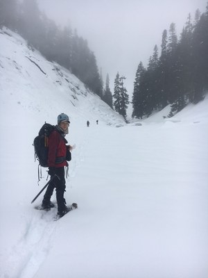Snowshoes starting shortly after Pumpkinseed Creek. Crossed Dingford Creek on log after Goat Creek, followed Price Creek up steep gully, with 2 steep steps on right to bypass waterfall areas being most technical part of scramble. Took pleasant open snow gully SE above Price Lake to NW slope, no problems above this upper gully. Some forded creek on way back. Heavy wet snow, light rain in a.m., fog on summit, some rain on return.