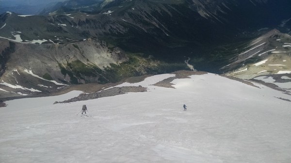 We stripped our skins and skied down the snowfield. Then carried them to a final finger or snow down to the base of the ridge. Crossed over the river and grabbed some food in Glacier Basin before hoofing it out. We left Glacier Basin about 4:30 and got to the cars about 5:40pm - pretty fast out.