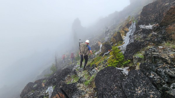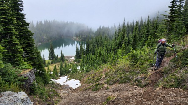 Unfortunately, it's another day in the clouds so we don't leave camp till about 10am. Looking back at the lake as we head to the saddle east of Hawk Peak.