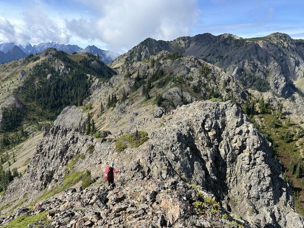 We followed the ridge up to Welch Peaks. A mostly straight forward scramble with some T-3 and a couple T-4 sections. The weather was mostly clear with some clouds covering the low lands of Hood Canal and Puget sound.