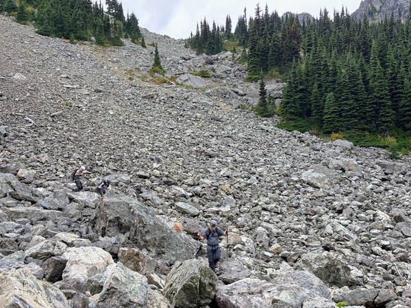 Down at the lake, a couple scramblers filter some additional water and we set off for short downhill trail before the trail climbs a few hundred feet back to the saddle where we first went off trail. We felt our first rain drops about a mile below Silver Lake at 3:20PM. By 4:00PM is was 100% rain and we put on jackets. By that point, everyone was motivated to just finish the day. We arrived back at the trailhead at 5:15PM.