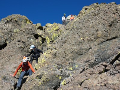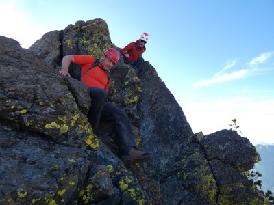 From the summit, we dropped down the south slope. We crossed a little ledge across the top of a gully, then dropped down to this place where it looks like you want to stay left, but actually are supposed to hook right a bit. Dropped down steep slope that led to a class 3 move that got us down to the ridgeline.