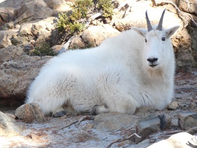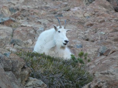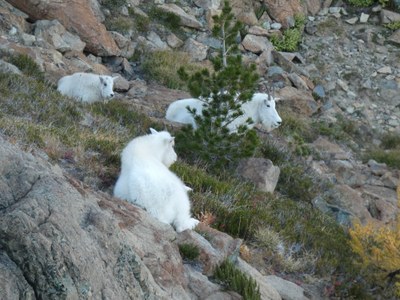 From the top of Fortune, there appeared to be several ways down. One option is the west ridge down to the pass before Lake Ann to hike out that trail. Another is the east ridge back to Ingalls Pass or to drop down from Lake Camp Fire Girls. But by far the best option that I picked was top drop down the NE broad open rocky slopes of the peak back down into Headlight Basin. My GPS track is an ideal route! The key is to keep working NE back toward the big broad gully that comes down from the South Ingalls-Fortune ridgeline and it leads right back to boot paths that lead to the main trail. We passed a group of 5 goats on the way down.