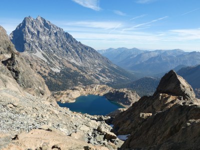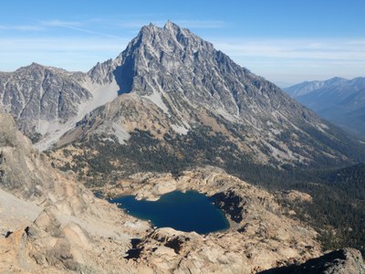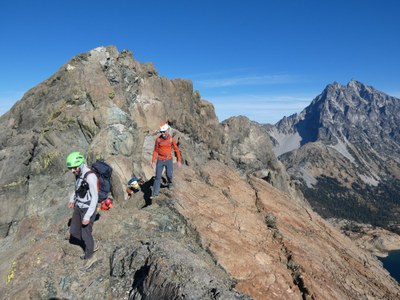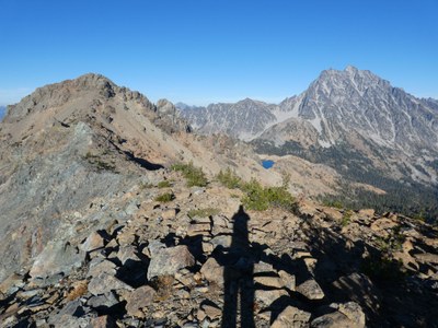 We scrambled down the really fun class 3 ridge to Ingalls Pass. There was some brief mild exposure here and there and the rock was really solid and ideal. Don't be tempted to drop off the left side of the ridge too soon; stay on the fun stuff on top of the ridge! If you encounter anything too tricky, it is always easy enough to go around it to the left.