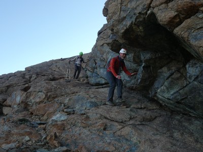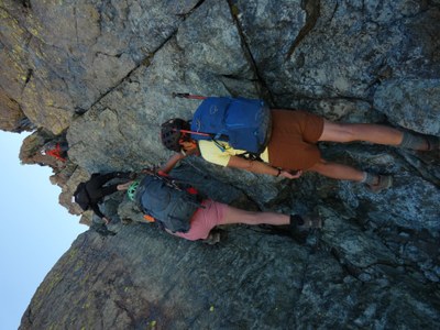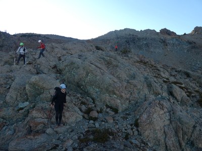 A couple of us filtered water at the lake (I don't understand how the others didn't need to!) and then we began to head up really nice slabby rocks up toward Ingalls-South Ingalls col. We stayed a bit left to make sure we stayed out of the big gully more to the right. As we got higher we began to follow cairns and as we approached sort of a "mini-peak" ahead of us, we wrapped around the left side of it. Once on the other side of it, we came to a place where we dropped to the right into the main gully where we followed the climbers path up some nasty loose scree and dirt to the Ingalls-South Ingalls col.