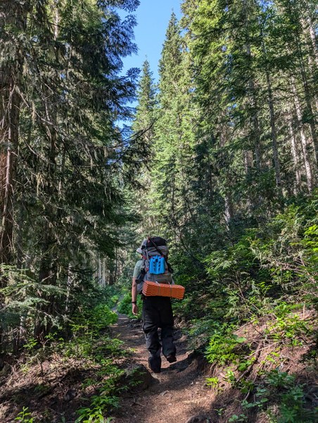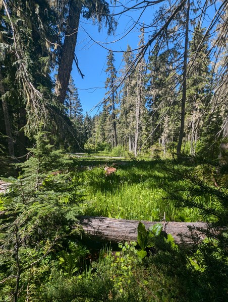 Leaving to deal with it on the way back, we sprayed ourselves (bathed ourselves) in bug spray and headed up the trail. The forest section which about 3-4 miles was mostly flat and we made quick time. We had some blow downs and beautiful meadows along the way