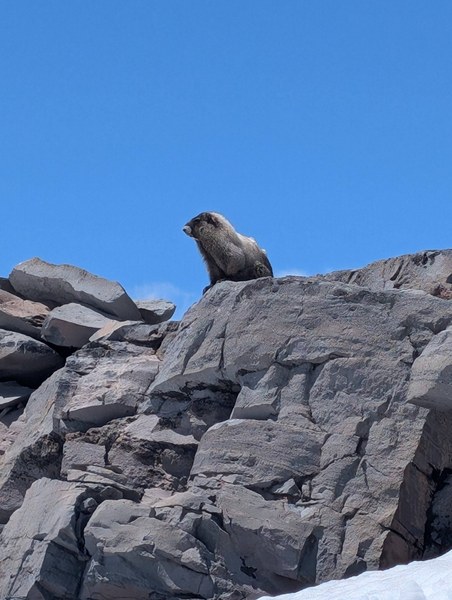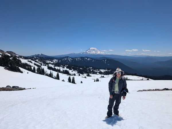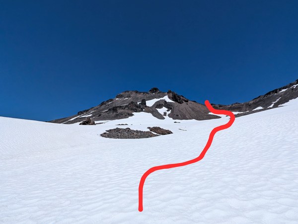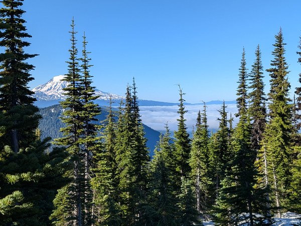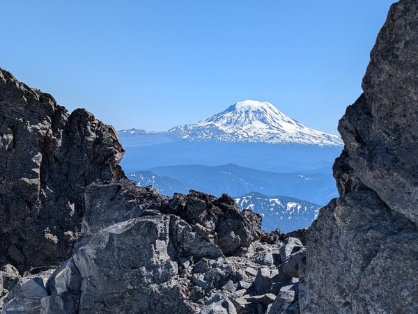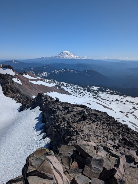We left at 1.30pm hoping to make both summits on day 1. We travelled on snow from camp, no need of crampons or snowshoes. I broke trail to the summit, which felt good after a long time.. we had amazing views of Rainier and Adams all along.