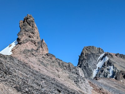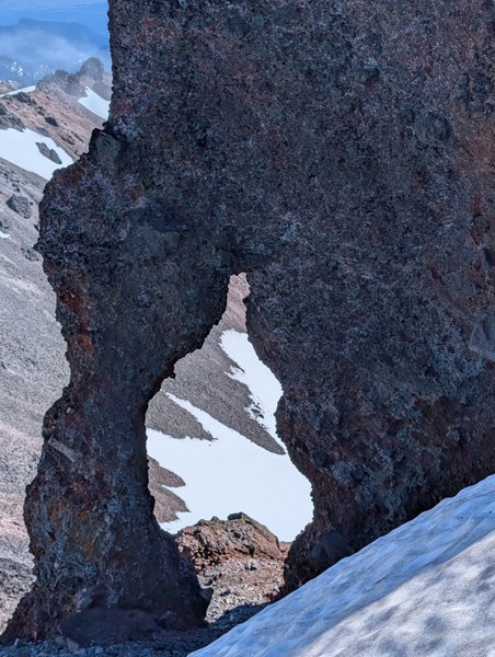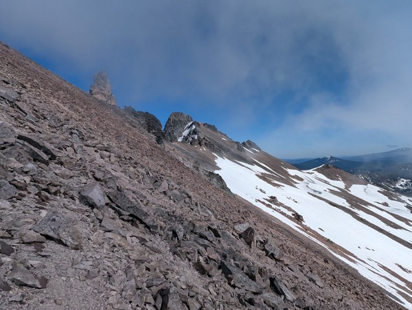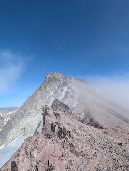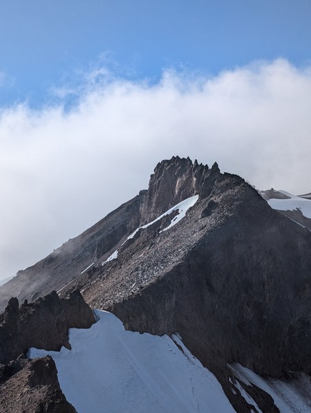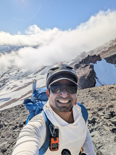 We had about 200 feet of rock to transition from snow to the ridge and 300 feet of rock to the summit. It was lose rock and with Tim not comfortable on loose rock, so we took it slow traversed to the backside of the ridge to travel on more snow and we made summit at 4.30pm