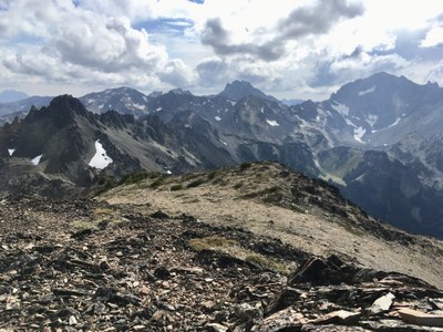 The views were absolutely stunning for the return portion of this trip on the open ridge crest connecting North Petunia, Point 6763, and Point 6626 (W to Gray Wolf Ridge, SW to upper Royal Basin/Deception/Mystery, NE to San Juan Islands, SE to Buckhorn, Marmot Pass, Constance, S to The Brothers).