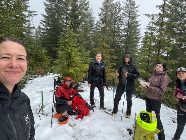 Most of our group put on microspikes for the log crossing, which was less slippery than anticipated. After crossing, we walked along the river to avoid bushwhacking for as long as possible. Once we entered the forest, we were able to follow game trails before starting to ascend. Our track started up slightly climber's right of our intended route and we had to negotiate some log jams.