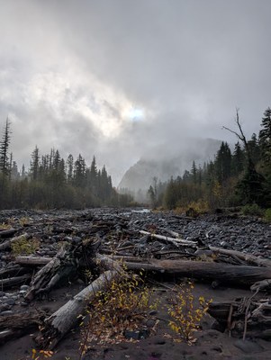 Oh Pigeon Peak... universally claimed to be one of the most unpleasant scrambles offered by the Mountaineers and the worst of the Rainier 100 peaks. A boring road walk that isn't quite long enough to make it worth bringing a bicycle, terrible bushwhacking, no fun rock scrambling, no ability to glissade in winter, and no views. As if it couldn't get worse, we went on a cold rainy day in November.