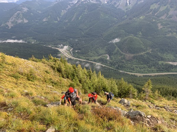 The drive to the trail head was accompanied by a rain shower but otherwise uneventful; the road is in pretty good shape. We started hiking at 5 pm under a light rain shower but we were almost immediately into the tree canopy and did not keep the rain jackets on for long. We donned helmets for the rocky/scrambling section around tree line and some people stowed away poles to be able to use both hands on rocks and veggie belays.