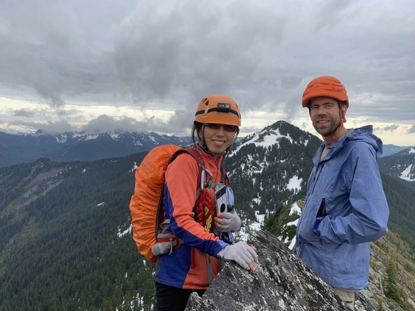Once gained the ridge in open terrain, the rain had stopped and the rocks/trail were only slightly damp. Not particularly slippery. The clouds and evening light were playing cool visual effects and we reached the summit after the last rocky scrambling section in just around 2 hours from the start (including a couple of short breaks). We had an evening snack, signed the register, snapped some photos and 20 minutes later we begun the descent. There is still snow on Defiance but Web is also snow-free. Weather stayed dried. We did not need to turn on headlamps until the last mile or so and some people were still able to see without them on. The entire group was back at the car at 9:24 pm.