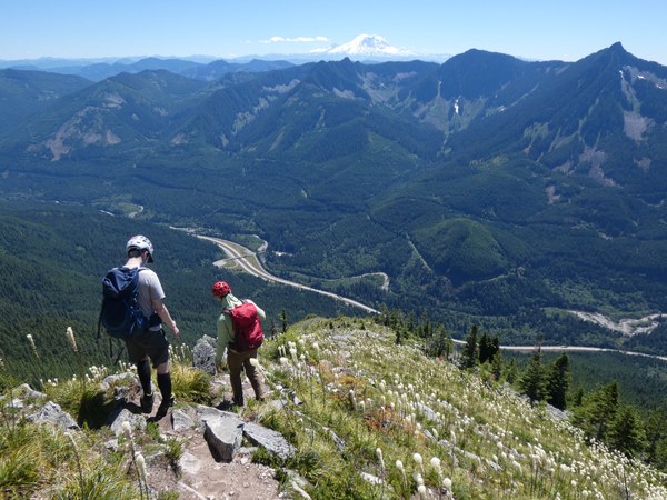 Starting from the lower trailhead at Exit 42 at 9am, we followed the trail up along Mason Creek to Road 9030, walking it to the Ira Spring Trailhead. From there we followed the standard route up Putrid Pete's Peak, starting with switchbacks up through the forest until the trail became very steep, shooting straight up toward the sky! The trail broke out of the trees and despite the grueling heat, the abundant blooming beargrass and the nice views eased the suffering. We followed the steep path to the base of P3's summit block, which involved a simple short rock scramble to the top. We arrived at the summit of P3 a little before 12:30.