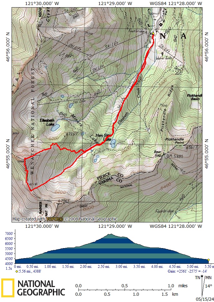snow was surprisingly good, a little on the soft side. on the way up, went in the general direction andy c went. for descent, we took a very mellow route that worked quite well - headed due south, then took a very mellow glissade, with an excellent runout, into the basin ese of the summit, then followed the easy terrain back.