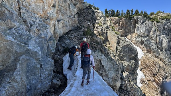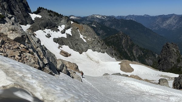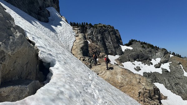 - The snow traverse on the North side of the East Snoqualmie is quite steep, please bring crampons /ice axe and be prepared to dagger downclimb. The snow was very firm even in a scorcher of a day like today and we were happy to bring crampons with us.