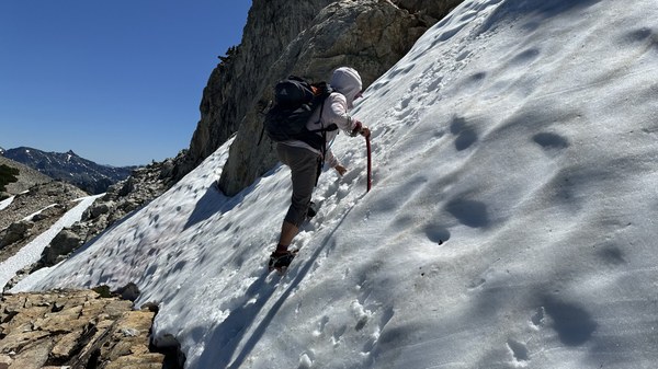 We followed the snow for about half of the snow traverse until we hit some melted out rocks and even steeper snow, so we negotiated some high dagger downclimbing onto the slabby ramp instead. Please be very careful here, the runout is awful and the there's a cliff right off the slabby ramp into a void...